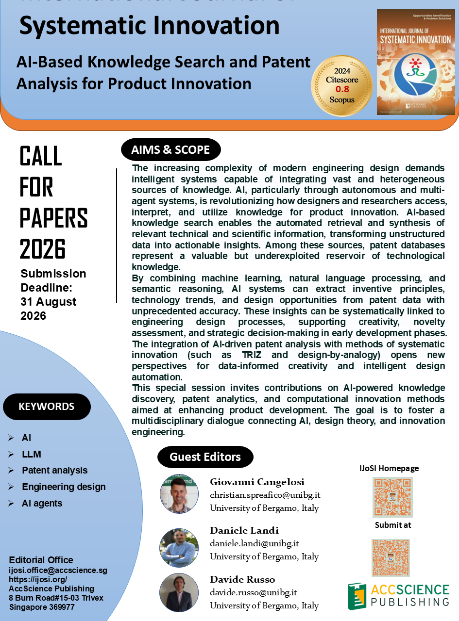 This special session invites contributions on AI-powered knowledge discovery, patent analytics, and computational innovation methods aimed at enhancing product development. The goal is to foster a multidisciplinary dialogue connecting AI, design theory, and innovation engineering.