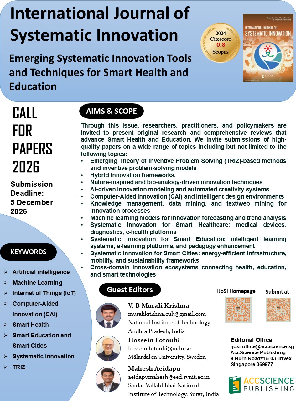 The special issue invites high-quality research articles, reviews, and case studies that focus on innovative frameworks, analytical tools, and computational systems for enabling systematic innovation in the domains of smart healthcare intelligent education systems and sustainable smart developments. Contributions may address theoretical advancements, implementation models, or hybrid approaches that blend traditional systematic innovation methodologies with digital and AI-based techniques.