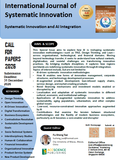 Systematic innovation methodologies—such as TRIZ, Design Thinking, and Lean—are being hybridized, challenged, and redefined through integration with artificial intelligence. In this Special Issue, we adopt a broad interpretation of systematic innovation, encompassing not only traditional industrial engineering approaches but also organizational, technological, product/service, and financial innovations. Moving beyond the narrative of simple technology transfer, we explore how diverse cultural contexts, rapid digitalization, and pressing societal challenges are reshaping the very practice of systematic innovation in tandem with AI capabilities. We invite interdisciplinary contributions that examine the tension between structured methodologies and the fluidity of modern business ecosystems, particularly as AI becomes a core enabler and disruptor of innovation processes across multiple domains—from business models and corporate structures to market-creating products and novel financing mechanisms. From AI-driven product development and leaninfused supply chains to frugal innovation and service design, this issue seeks empirical and theoretical updates on how systematic innovation is being localized, digitized, and augmented by AI to address complex challenges such as sustainability, aging populations, and urbanization. By bridging engineering, design, organizational behavior, public policy, finance, and data science, this Special Issue aims to capture how regions worldwide are not merely adopting systematic innovation but fundamentally transforming it through AI integration for a new era.